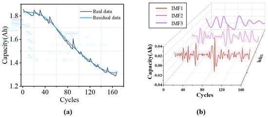 Residual and IMF curves of battery B0005. (a) Real data and Residual data of battery B0005. (b) Three IMFs of the capacity data.