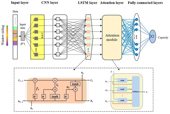 Nevertheless, challenges persist in extracting health features from measured parameters (e.g., voltage, current, and temperature) [24]. Some health features, including internal impedance and temperature distribution, demand precise measurement techniques or continuous monitoring. Additionally, extraction methods often lack generalizability, restricting the applicability of models [16]. Therefore, there have been studies that no longer perform artificial feature extraction and directly predict future trajectories based on the collected data such as voltage, current, capacity, etc., and thus predict the battery RUL. Zhou et al. [25] proposed a method for predicting RUL using the autoregressive integrated moving average (ARIMA) model; however, this model necessitates highly stable time series data and stringent operating conditions for the battery. Ma et al. [26] proposed a CNN-LSTM neural network with an FNN (false nearest neighbor) algorithm, which uses the false nearest neighbor method to calculate the sliding window size required for prediction, and substitutes the test data into the trained CNN-LSTM model to iteratively predict the capacity decline trajectory, which in turn yields the RUL value. Liu et al. [7] developed a data-driven RUL prediction method by implementing the ISSA-LSTM model. They optimized the hyperparameters of the LSTM using an improved sparrow search algorithm (ISSA), addressing the challenge of manually tuning the LSTM parameters and enhancing the algorithm’s capability to escape the local optimum. Wang et al. [27] used the variational modal decomposition (VMD) algorithm to decouple the measured capacity data, separating the general trend in the capacity data and the high-frequency oscillations, divided the battery data into 70% training set and 30% test set, and designed a TCN-attention based RUL prediction algorithm framework.