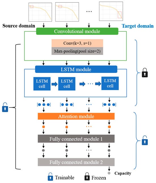 A deep transfer learning strategy is designed to enable real-time personalized predictions of battery aging trajectories by utilizing insights from diverse yet related battery degradation data. Initially, the transfer learning model undergoes retraining with preliminary capacity degradation data from batteries within the target domain and then the retrained model is used to predict subsequent decline trajectories of its batteries. The source domain is the initial training domain for pre-trained models, which usually has a large amount of labeled data and rich features. The target domain is the domain of the transfer learning application, which usually has less data and scarce labeled data. The data distribution, feature space, and task objectives in the source domain can be different from the target domain, but can also have some degree of similarity. Deep transfer learning models are flexible and can be quickly adapted to new operating conditions by dynamically fine-tuning specific network layers [44]. We adapt to the new battery by tuning the attention layer and fully connected layers of the network. This is shown in Figure 6.