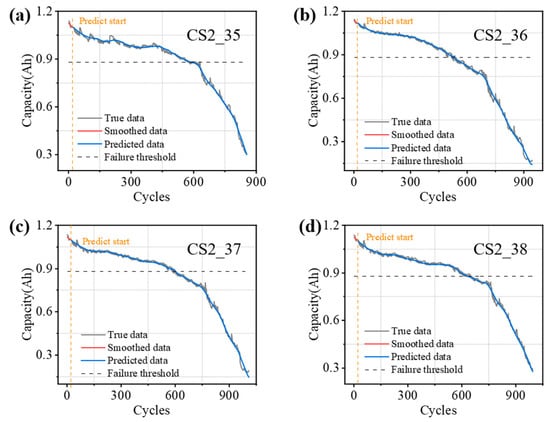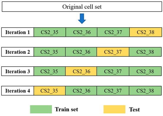In the source domain, we use the cross-validation method to divide the CALCE dataset into training and testing sets, as shown in Figure 7. In the cross-validation process, one cell is sequentially selected as the test cell and the remaining three cells are used as the training cells for a total of four iterations. In each iteration, the model is trained using the training set and the model performance is evaluated using the test cell. By validating models on multiple subsets, cross-validation provides a more stable and reliable assessment of model performance, reducing the impact of randomness associated with a single training-validation division. This process was repeated for four iterations and the test results at the test battery are shown in Figure 8. The capacity data from the 1st to the 20th cycle were used as the first input for the test, i.e., the 21st cycle was the first prediction point.
