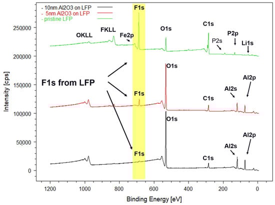The chemical composition of the pristine LFP electrode and the same substrate coated with 5 nm and 10 nm of Al2O3 deposited by ALD was analyzed by XPS. The broad survey spectra are presented in Figure 1: in green the spectrum acquired on the pristine LFP electrode are shown, in red the spectrum acquired on the LFP coated with 5 nm of Al2O3 and, finally, in black the spectrum acquired on the LFP coated with 10 nm of Al2O3.