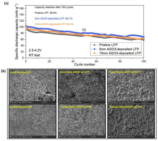 (a) Cycling performance of Li/LFP cells with and without Al2O3 deposition, in the range of 2.5–4.2 V at 1C (1C = 170 mA gLFP−1) and RT. The test was performed after 10 cycles at 0.1C. (b) Top-view FE-SEM images of the electrodes in the fresh state and 100 cycles at 1C.