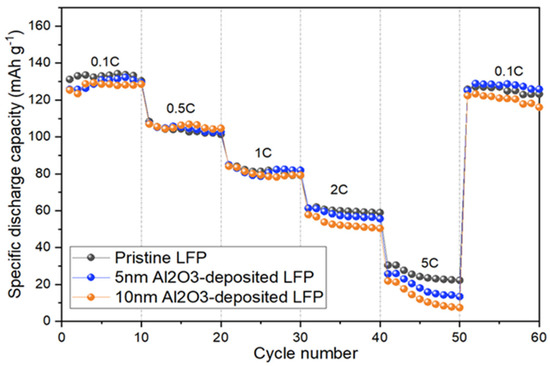 The performance of the pristine and 5 nm and 10 nm Al2O3-coated LFP electrodes at different C rates. The test was conducted at RT and within a voltage range of 2.5–4.2 V.