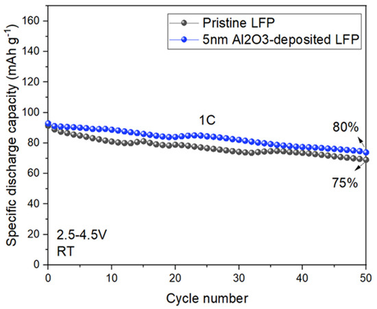 The market share of low-voltage LFP cathodes is currently increasing due to its economical nature, high thermal stability, lack of toxicity, and safety features. Although its discharge voltage plateau is lower than that of other cathodes, such as LiCoO2, the stable discharge voltage of LFP within the electrochemical stability window of existing electrolyte systems serves to prevent electrolyte decomposition and the development of a Solid Electrolyte Interphase (SEI) [9]. The stability of LFP is credited to its olivine structure and secure P-O bonds [39]. Despite the overall stability of low-voltage cathode materials like LFP, during overcharging the small size of LFP nanoparticles can trigger adverse reactions, leading to SEI formation and degradation in LIBs’ performance [40]. This may result in local heating, causing cell destruction, with potential ignition. In this work, in addition to the evaluation of the performance of both pristine and 5 nm Al2O3-coated LFP electrodes within the voltage range of 2.5 to 4.2 V, an exploratory investigation has been initiated to understand the impact of increased upper cutoff potentials, specifically set at 4.5 V, on the cyclability of LFP electrodes. As depicted in Figure 5, the coated sample exhibits superior performance in comparison to the pristine LFP, indicating that the Al2O3 coating might efficiently shield the LFP electrodes from additional degradation.
