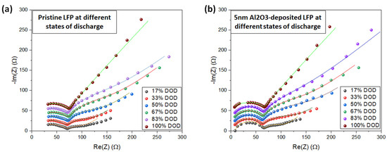 Nyquist plots and fitting lines for the EIS spectra at different states of lithiation for the pristine LFP electrode (a) and 5 nm Al2O3-coated LFP electrodes (b) are shown. The discharge was performed at 0.1C after 100 cycles at room temperature.