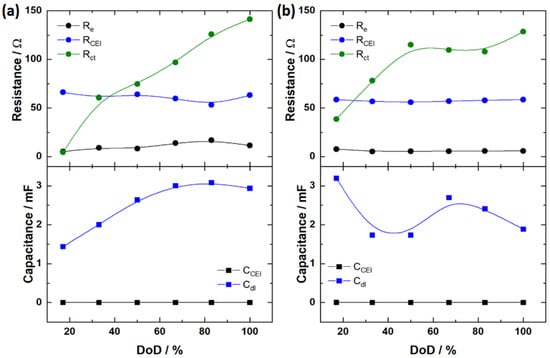 To gain a better understanding of the electrochemical performance of the samples, we conducted EIS on both pristine and 5 nm Al2O3-coated LFP electrodes. After stabilizing the cell, the electrode was completely charged and discharged at 0.1C, employing a different discharge cutoff voltage (Figure S3). Figure 6a,b displays the Nyquist plot for the EIS data recorded at various lithiation states of both electrodes. At intermediate frequencies, it is possible to see a depressed, large semicircle, which corresponds to the superposition of two semicircles related to the CEI layer formation and the charge transfer of the faradaic process; finally, at low frequencies a straight line due to diffusion is observed [41]. To better distinguish the semicircles, a Bode plot of the cells at 50% DOD is provided, as an example, in the Supplementary Information (Figure S4). To obtain the electrochemical parameters, the experimental data were fitted using an equivalent electric circuit (Figure S5), in which Re, RCEI, and Rct are the resistances of the electrolyte, CEI, and charge transfer, respectively, while CPE1 and CPE2 are the constant phase elements used to obtain the effective capacitance values CCEI and Cdl related to the CEI and the double layer, respectively, with the aid of the Brug equation, Equation (1) [42]. The W element represents the Warburg impedance associated with the diffusion process.