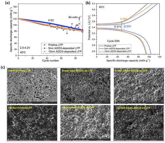 In addition to analyzing the electrodes at room temperature, the cycling performance of the electrodes at elevated temperatures is considered a crucial criterion. Figure 8 illustrates the electrochemical behavior and structural changes in both the uncoated and coated electrodes during cycling at 0.5C and 40 °C. According to Figure 8a, coated LFP electrodes with 5 nm and 10 nm Al2O3 exhibit more stable behavior compared to the pristine electrode. In the cell with pristine LFP particles, there was a capacity fluctuation after 40 cycles of charge/discharge, likely due to the unstable reaction between the electrode and the electrolyte. Consequently, uncontrollable side reactions between the electrolyte and the LFP cathode led to electrolyte decomposition, resulting in an unstable interface layer. In contrast, cells fabricated using Al2O3-coated LFP electrodes exhibited stable behavior, indicating that side reactions at the interface were suppressed by the Al2O3 coating. Among all the cells, the LFP electrode with a 5 nm Al2O3 ALD coating showed the highest capacity. The sample with the 10 nm coating also demonstrated good performance, but with less capacity compared to the 5 nm Al2O3-coated LFP, possibly because the thicker Al2O3 coating suppressed undesirable side reactions, while extending the lithium-ion transport pathway, resulting in increased resistance. Figure 8b illustrates the charge/discharge curves of the electrode at the 50th cycle. The overpotential of the pristine sample is higher than the other two coated electrodes, consistent with the cycling performance. Moreover, the top-view SEM images of the electrodes (Figure 8c) after cycling at 40 °C display morphological changes and crack generation on the pristine LFP surface, while the coated LFP surface undergoes minimal changes. These results further confirm that Al2O3 coating can suppress undesirable side reactions between LFP and the electrolyte, leading to better cycling behavior.