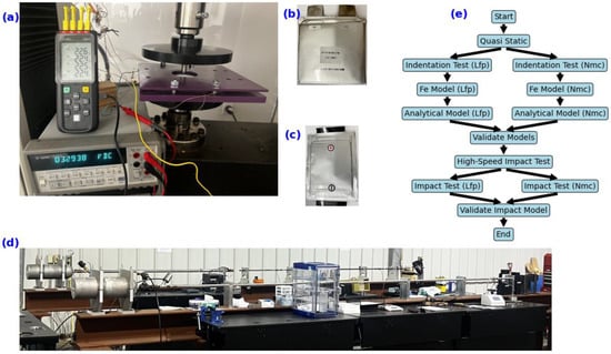 (a) Experimental setup for the indentation test. (b) LFP pouch cell. (c) NMC pouch cell. (d) The impact penetration test. (e) Flow chart: the experimental setup includes an indentation test for both LFP and NMC pouch cells, as well as a high-speed impact penetration test to validate the models.