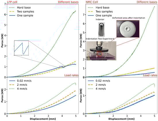 In previous studies [4,14,26,29,30,31,32,33,34,35], indentation tests on pouch cells were often conducted without considering the influence of the mechanical machine’s platen. This approach resulted in an oversight, as the indentation caused a bulge in the pouch cell beyond a critical depth, leading to a rapid increase in force values.