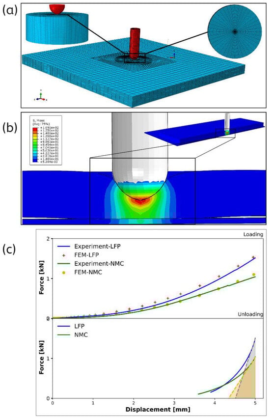 Comparing these computational results with the experimental findings, especially in the third scenario involving a stack of two pouch cell samples (NMC and LFP) in the fixture, highlighted the substantial difference in the maximum load between the first and third scenarios. To ensure a comprehensive analysis in this research, the third scenario from the previous experimental section was selected to evaluate the LIB cell’s behavior under indentation testing conditions in the computational model.
