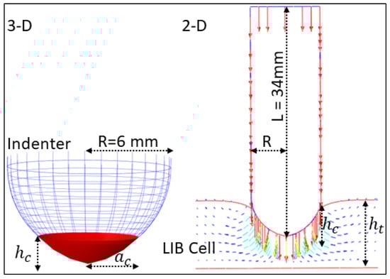 Nevertheless, load (P) and displacement (h) are continuously recorded during the indentation test. It is essential to have stress—strain data, which is beneficial for the analysis, design, and prediction of the mechanical behaviour behavior of the LIB cell under indentation tests. In the authors’ previous research, cylindrical cells were indented with a cylindrical indenter, and a novel formulation was created to convert force—displacement data into stress—strain data [24,25]. The primary objective of this investigation is to address a gap within existing experimental tests. This involves characterizing stress—strain data obtained from applying a hemispherical indenter on the pouch cell and formulating a damage criterion at the cell level. Consistency across varying loading conditions is en-sured by employing the same projectile geometry in both tests and extracting the constitutive equation from the static loading.