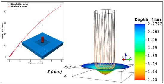 Due to the impracticality of experimentally measuring contact area during indentation tests, Finite Element Method (FEM) modelling offers a viable alternative for obtaining this crucial information. Equation (8) presents an analytical model for determining contact area based on contact radius ( in this study. The analytical results exhibit a strong agreement with FEM outcome, as shown in Figure 5.