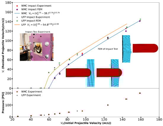 Figure 7 characterizes the residual velocities for NMC and LFP battery cells under high-speed penetration tests, showing the FE model for both LFP and NMC samples. The results show good agreement between experiment and simulation models. However, due to the use of a gas gun for the impact test, Figure 7 includes data for the pressure versus initial velocity, illustrating the relationship between the applied pressure and the resultant velocity. It is clear that based on the geometry and weight of the projectile, the initial velocity created from the pressure will vary.