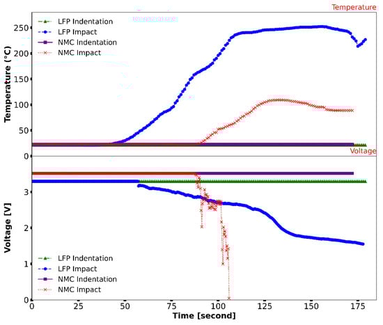 In the evaluation of voltage and temperature changes during indentation tests (static loading) and high penetration tests (dynamic loading), distinct observations emerged, as shown in Figure 8. For the indentation tests on NMC and LFP pouch cells, no discernible alterations were recorded in voltage and temperature, indicating the absence of internal short circuits. Conversely, in high penetration tests where the projectile entirely traversed the battery, both voltage and temperature exhibited no variations, suggesting a lack of connectivity between the collectors and the absence of an ensuing internal short circuit. In contrast, high impact penetration tests involving partial projectile penetration led to a different outcome. Notably, these tests resulted in cell ignition and a decline in voltage, indicative of an internal short circuit occurrence.
