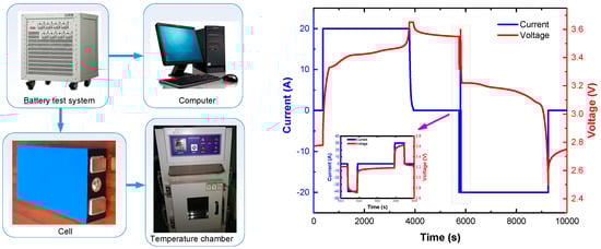 To obtain the aging data of batteries, a test platform was established, as shown in Figure 1. A battery testing system, BTS4000 (Neware, Shenzhen, China), was used to run the defined charge/discharge cycles. Eight commercial LiFePO4 batteries were tested in the experiment, and cell specification is shown in Table 1. The cells were placed in the temperature control chamber to maintain a stable ambient temperature during the charging/discharging process. Capacity degeneration is closely related to the charging environmental temperature. To accelerate the aging process, the ambient temperature for charging and discharging was set at 35 °C. A standard charge/discharge regime was applied on the cells, which was composed of constant current (CC) charging with 1C to the cut-off voltage, then constant voltage charging to the cut-off current of C/20, and CC discharging with 1C to a cut-off voltage. The rest time between charge and discharge was set to 0.5 h.