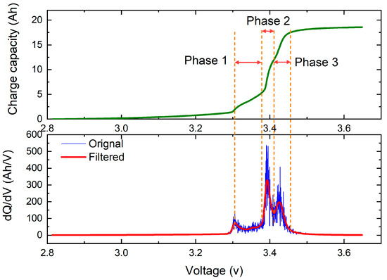 The IC curve reveals the phase-equilibrium-induced voltage plateau. The peaks of curves are in the range of the voltage plateau. In the voltage plateau region, the capacity increases rapidly with small voltage changes. Due to the limited voltage sampling frequency of charging and discharging equipment, the linear interpolation method was used to obtain the capacity with equal voltage intervals. A large voltage interval may miss some significant information in this region. To obtain complete information on the IC curve as soon as possible, the small voltage internal was set as 1 mV. The peak value of the IC curve and its corresponding voltage platform are shown in Figure 2. The slope of the voltage capacity (V-Q) curve has three obvious changes, which correspond to the three conspicuous peaks of the IC curve. Each peak represents the phase transition point of the materials inside cells, which can characterize the lithiation plateau, transforming into different lithiation stages. The area enclosed by the curve and axis manifests the capacity change in the phase transition. From the picture, it can be observed that the raw IC in the range of the voltage plateau fluctuates greatly. Therefore, it is necessary to smooth the original curves through a filtering algorithm. In this work, the Gaussian filter method was adopted to preprocess the raw IC curves, which can alleviate the effect of the interference in different cycles on significant IC curve feature extractions.