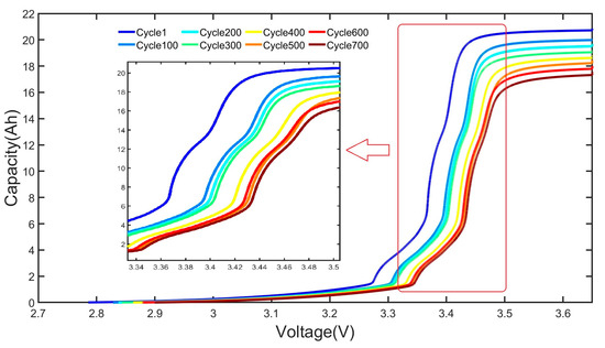 To investigate the relationship between the charge capacity and voltage, partial V-Q curves during 700 cycles are demonstrated in Figure 3. The curves almost overlap in the range from 2.7 V to 3.15 V. In the range of 3.15 V–3.65 V, the difference between curves is relatively large due to capacity degeneration. From this view, as the cycle increases, the position of the voltage plateau is offset to the right. This phenomenon suggests that the peaks of IC curves shift as the battery ages. However, as the cycle progresses, this trend becomes less significant. From the enlarged view, the slope of the voltage plateau becomes slowed down from cycle 1 to cycle 701, especially in phase 3. In other words, the heights of peaks decrease with battery degradation.
