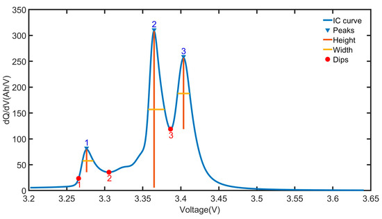 To further verify these findings, all the IC curves during 701 cycles are demonstrated in Figure 4. It is evident that the positions of curve peaks shift and the height of the peaks changes, especially the third peak. Moreover, the initial and end voltage values of the voltage platform are also different. As a battery ages, the peaks may become less pronounced, and the IC curve may flatten overall. This demonstrates that changes in the positions, shapes, and heights of peaks and dips over time can provide information about a battery’s state of health. Therefore, we extracted the features of IC curves considering these changes, and the features include the positions of peaks (LP1, LP2, LP3), heights of peaks (HP1, HP2, HP3), width of peaks (WP1, WP2, WP3), positions of dips (Ld1, Ld2, Ld3), and heights of dips (Hd1, Hd2, Hd3), as shown in Figure 5. It was observed that all the peak features were in the voltage range of 3.2 V to 3.5 V. The state of charge of batteries in the voltage range was 20–85%, which is exactly the actual working range of most battery systems such as electric vehicles.