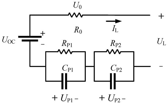 Equivalent circuit models are widely used to recognize and estimate the internal parameters of batteries, which are crucial for understanding and managing battery performance. These models provide a simplified representation of the complex electrochemical processes occurring within the battery, making it easier to analyze and control. Commonly used equivalent circuit models of batteries include Rint, Thevenin, 2RC, PNGV, and GNL models. The Rint model is simple, involving only an OCV and a single resistor, which does not capture the dynamic response of the battery to changing loads and conditions, leading to less accurate predictions of battery performance. The single RC branch in the Thevenin model captures only basic transient behavior, leading to less accurate representations of the battery’s dynamic performance, especially under varying load conditions. The PNGV and GNL models are more sophisticated battery models, so the process of identifying and calibrating the parameters is more complex and time-consuming compared to the 2RC model. The 2RC model provides a more accurate representation of a battery’s behavior, especially under varying load conditions. By including two RC pairs, this model captures both the short-term and long-term dynamics of the battery, reflecting its real-world performance more closely. Compared to the Thevenin model, the 2RC model can more effectively represent these non-linearities, improving the predictive capability of simulations and control systems. By capturing both fast and slow dynamics, the second-order RC model can provide better insight into the SOH of the battery. This allows for more precise monitoring and diagnostics of parameters like internal resistance and capacitance, which are indicative of aging and degradation. A 2RC equivalent circuit model was used in this work, as shown in Figure 6. R0, R1, and R2 represent the ohmic internal resistance and polarization resistance of cells, respectively. The dynamics of 2RC circuits can be given as shown in Equation (2) [31].