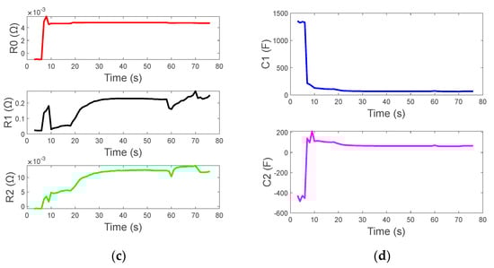 The Hybrid Pulse Power Characterization (HPPC) test profile was added in each discharge cycle, as demonstrated in Figure 4, and was used to generate data for identifying the parameters of 2RC models. Internal resistance varies with the environmental temperature, the SOC of batteries, and the SOH. To eliminate the interference of temperature and the SOC, testing was carried out in a constant environment temperature, and the HPPC test was conducted in the same SOC state during the discharge phase. The data of HPPC were used to identify the parameters of the 2RC model by the RLS algorithm, as shown in Figure 7. As demonstrated in Figure 7a, the predicted terminal voltage was in good agreement with the experimental one. The error between the predicted and experimental is illustrated in Figure 7b, and the mean absolute error was less than 0.4 mV. This indicates that the identified parameters accurately represented the battery’s behavior. The identified parameters of the equivalent model are shown in Figure 7c,d. The average value of the identification parameters during the relaxation phase was taken as the final value for each parameter.