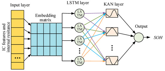 In the above section, the features of IC curves and the parameters of internal resistance were obtained. Next, the extracted features and internal resistance were taken as input parameters, and the output was the SOH. From Figure 4, it is observed that the IC curves did not all shift to the right as the cycle increased; rather, the curve offset presented a time series characteristic. Here, the LSTM network was used to process the IC curve features and internal resistance parameters and capture the temporal dependencies. In the hidden layer before output, the KAN layer was used to replace the standard fully connected layers in the LSTM. The structure of the proposed SOH estimation model based on LSTM-KAN is shown in Figure 9. This framework provides a robust approach to estimate the battery SOH using LSTM-KAN and features derived from IC curves, leveraging the strengths of the LSTM in handling sequential data and the KAN in decomposing complex multivariate functions to achieve accurate and reliable SOH predictions. The input parameter matrix consists of 18 parameters, including 15 IC features, and 5 parameters of 2RC equivalent circuit models.