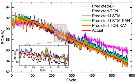 To ensure the trained model’s robustness and generalization ability, a validation dataset was used to evaluate its performance. The data for Bat. #5 were used as the validation dataset. The results of the validation are illustrated in Figure 11, which demonstrates that the trained models also have good performance on the validation dataset. The values predicted by the five models show a similar trend to the actual SOH but with a noticeable offset from the actual SOH in the BP and TCN models. From the enlarged view, it can be observed that the SOH predicted by the LSTM-KAN model is closer to the actual value. Similar to the results of the test data, the prediction error of the BP model is the largest in the validation dataset.