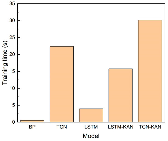 The results of the test and validation data confirm the superior performance and generalization ability of the hybrid model compared to the standalone network. The consistency of the hybrid model’s performance across both the training and validation datasets suggests that it effectively captures the underlying patterns of battery degradation. This demonstrates that the hybrid model not only performs well on the training data but also maintains high accuracy and stability when applied to new data. The error metrics of the five models on the test and validation dataset are shown in Table 3. It demonstrates that the prediction errors of the BP model are the largest among the five models. All the errors of the hybrid model are smaller than those of the original model. In the test dataset, the LSTM-KAN model has the fewest errors, and the MAE, MAPE, and RMSE are 0.412%, 0.462%, and 0.570%, respectively. In the validation dataset, the MAE of the LSTM and LSTM-KAN are 0.438% and 0.256%, which is in good agreement with the results of the test data. The SOH estimation performance of the LSTM-KAN and TCN-KAN models is comparable. The above results demonstrate that combining the KAN can effectively improve the estimation performance of conventional machine learning models, and the LSTM-KAN model has the best performance in SOH estimation, with a comprehensive comparison of testing and validation data results. Therefore, the LSTM-KAN model was used to further investigate the model performance under different input parameters. The training time of each model is shown in Figure 12. In Refs. [11,12], the SOH estimation models are established based on similar methods, but the estimation error (MAE: 1.16%, 1.957%) of the model in the literature is far larger than that proposed in this work (MAE: 0.412%).