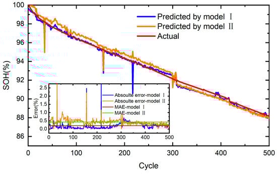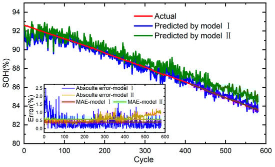 To investigate the improvement of the model after integrating internal resistance parameters into the input variables, the training data were divided into two groups: group Ⅰ and group Ⅱ. The input variables in model Ⅰ include 15 features extracted from IC curves and internal resistance parameters, and those in model Ⅱ only contain 15 features extracted from IC curves, as demonstrated in Table 4. The corresponding SOH estimation models, model Ⅰ and model Ⅱ, were trained using datasets from group Ⅰ and group Ⅱ, respectively. Figure 13 illustrates the SOH of Bat. #5 predicted by two models. The results show that the predicted SOH is closely aligned with the actual value. Model Ⅱ shows greater variability and deviations from the actual SOH compared to model Ⅰ. The performance of the two models on the validation samples is demonstrated in Figure 14. Similarly, model Ⅰ demonstrates better prediction performance than that of model Ⅱ. From the subplots, model Ⅰ has a lower MAE in the test and validation dataset. This indicates that the integration of internal resistance parameters into the input parameters can improve the model’s performance.