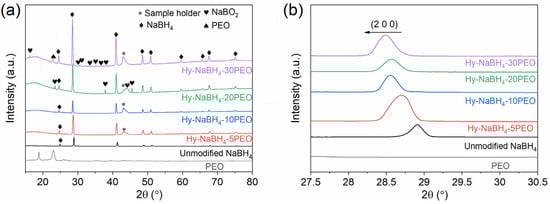 (a) X-ray diffraction XRD patterns of Hy-NaBH4-5PEO, Hy-NaBH4-10PEO, Hy-NaBH4-20PEO, and Hy-NaBH4-30PEO. Unmodified NaBH4 and PEO are shown as references. (b) Enlarged view of the (200) peak for Hy-NaBH4-5PEO, Hy-NaBH4-10PEO, Hy-NaBH4-20PEO, and Hy-NaBH4-30PEO.