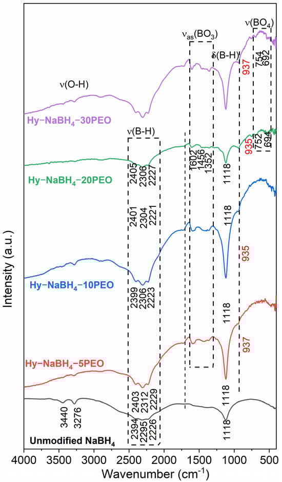 FTIR was used to identify the amorphous phases in Hy-NaBH4-PEO as well as any chemical bonding between PEO and NaBH4 (Figure 2). In Hy-NaBH4-PEO, the typical B–H stretching modes shifted to higher wavenumbers, suggesting a strengthening of the BH bonds after PEO incorporation []. The absorption bands at 1602–1352 cm−1 were assigned to the asymmetric stretching modes of the BO3 unit in NaBO2 [,,], confirming the partial oxidation of NaBH4 in Hy-NaBH4-PEO. A new vibration located at 937 cm−1 appeared in Hy-NaBH4-PEO, and this was assigned to a lower symmetry of the tetrahedral BH4− anion as a result of the ion-pair interactions between PEO and the BH4− anion []. The stretching modes at 600–800 cm−1 appearing in Hy-NaBH4-20PEO and Hy-NaBH4-30PEO also suggested that higher amounts of NaBO2 in the materials increased the level of hydrolysis [,].