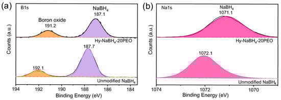 XPS of (a) B1s (b) Na1s of Hy-NaBH4-20PEO and unmodified NaBH4. The peak at 191.2 eV was assigned to the boron oxide phase [,].