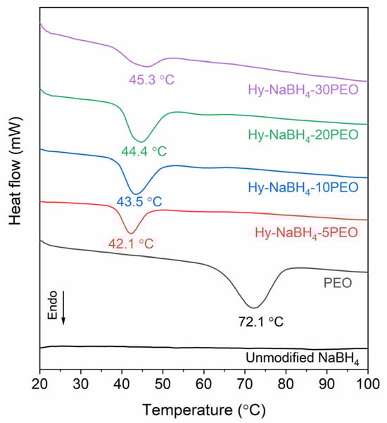 In the composite electrolytes, ionic conductivity has been reported to mainly occur in the amorphous regions through local segmental motion []. The level of amorphous phase can be evidenced by DSC []. As such, the melting transition temperatures of PEO in the Hy-NaBH4-PEO composites were thus analyzed by DSC (Figure 4). In PEO, the sharp endothermic peak located at 72.1 °C correlates with the melting of PEO [,]. For all Hy-NaBH4-PEO materials, the melting point of PEO reduced from 72.1 °C to 42.1, 43.5, 44.4, and 45.3 °C with 5, 10, 20, and 30 wt% PEO, respectively, and this reflected an overall decrease in crystallinity of PEO [,]. The degree of crystallinity (χc) of the PEO in the composite electrolyte was calculated by using Equation (1) []: