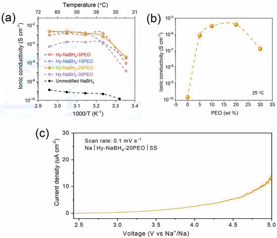 (a) Temperature dependence of the ionic conductivities of the Hy-NaBH4-PEO materials and unmodified NaBH4 shown as a reference; (b) correlation between the ionic conductivity of Hy-NaBH4-PEO with respect to the PEO amount; (c) linear sweep voltammetry (LSV) curves from open circuit voltage to 5 V with a scan rate of 0.1 mV s−1 for Hy-NaBH4-20PEO.