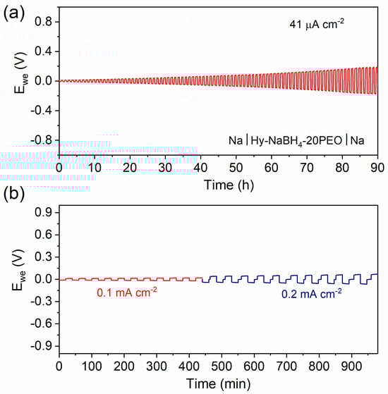 Voltage profiles during Na plating/stripping processes in (a) Na|Na symmetric cell with Hy-NaBH4-20PEO as the electrolyte at a current density of 41 μA cm−2 at 45 °C, and (b) symmetric Na|Hy-NaBH4-20PEO|Na cell cycled at various current densities of 0.1 and 0.2 mA cm−2 at 45 °C.