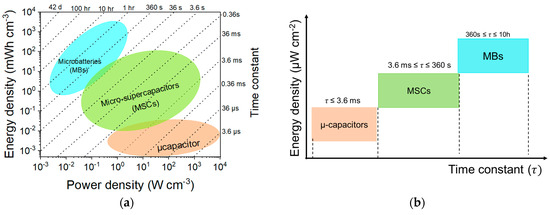 On the other hand, MSCs are miniaturized electrochemical capacitors that operate on the same principles as traditional supercapacitors; they offer higher capacitance and energy density but lower power density, rapid charge/discharge rates, and a longer cycle life compared with electrostatic (micro-/nano-) capacitors [42,43]. MSCs are a bridge between devices operating with short charge–discharge times (<0.1 s) and those with longer discharge times (>0.1 h) under and over which electrostatic (micro-/nano-) capacitors and microbatteries, respectively, find their niche [44]. The Ragone plot relates the energy density (E) and power density (P) for the micro-energy storage devices, using the numerical values to allow a performance comparison exhibited by different devices. The performance requirement of MSC depends on the intended applications. Nevertheless, it is important to take into account the collective fabrication of MSC at the wafer level and subsequently process compatibility with micro-/nanoelectromechanical systems (MEMS/NEMS) technology instead of lab prototyping in order to facilitate the technological readiness level of such MSC [6].