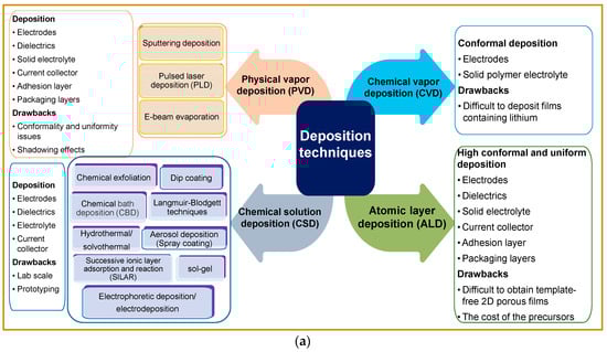Moreover, realizing miniaturized on-chip electronic energy storage devices requires meticulous functional material design and deposition techniques compatible with advanced microfabrication processes. Most electrode preparation methods employed in traditional macro-energy storage devices cannot satisfy the requirements imposed by the miniaturization process. In addition, many of the recent electrode preparation techniques for the development of flexible microdevices for printable electronics largely rely on wet processing routes by using colloidal solutions or suspensions of particles, which are not fully compatible with semiconductor device manufacturing usually encountered in the electronics industry [54,55,56]. Nevertheless, developing various functional material layers may involve more than one growth mechanism and micro-processing techniques. The commonly used electrode film deposition and device microfabrication techniques are shown in Figure 2. The microfabrication process may further be classified as top-down etching techniques, bottom-up printing techniques; and emerging microfabrication techniques, the details on these techniques can be found in the literature [6,11,57,58]. Thin film deposition of functional materials compatible with MEMS/NEMS technology is prioritized to speed up the technological readiness level of efficient on-chip micro-energy storage devices by collective fabrication at the wafer level. Vacuum deposition techniques, such as physical vapor deposition (PVD) and atomic layer deposition (ALD), are favored for this task and are commonly employed in the electronics industry. Although other techniques, especially solution-based routes such as electrophoretic deposition/electrodeposition (Figure 2), have been used to produce high-performance porous electrode materials or high-k dielectric materials for on-chip energy storage applications—such deposition techniques are instead suitable for lab prototyping [6,59].