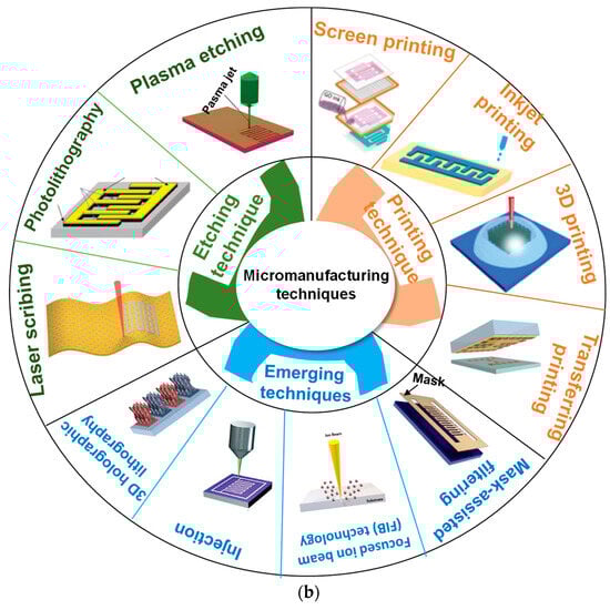 Microfabrication of functional materials for on-chip energy storage microdevices. (a) Thin film deposition techniques for electrode materials. (b) Microfabrication techniques for on-chip electronics energy storage systems. Laser scribing, photolithography, screen printing, inkjet printing, injection, and transferring printing. Reproduced with permission from [11]. © IOP Publishing Ltd. CC BY 3.0. 3D printing. Reproduced with permission from [60]. Copyright (2016), American Chemical Society. Focused ion beam (FIB) technology. Reproduced with permission from [61]. © MDPI. CC BY 4.0. 3D holographic lithography. Reproduced with permission from [12]. Copyright (2022), Elsevier. Mask-assisted filtering and plasma etching. Reproduced with permission from [17]. Copyright (2020), John Wiley & Sons.