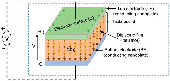 Electrostatic capacitors are energy storage devices typically consisting of two closely spaced parallel conducting electrodes separated by an insulating material known as a dielectric (see Figure 3) [64]. The configuration is designated as metal–insulator–metal (MIM). The device obeys Coulomb’s law when a voltage (V) bias is applied to the electrodes; it initiates a polarization of the dielectric by the applied electric field, resulting in a charge accumulation on opposing electrode surfaces; this is known as the electrostatic charge storage process [65,66,67]. Capacitance (C) is the most important performance metric for a capacitor, as it determines its capability to store charge.