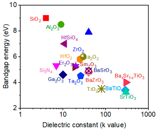 The ALD technique is usually preferred due to its unique features for fabricating ultrathin films, nano-laminating layers, high degree of thickness control, and conformal surface coatings in high-aspect-ratio trenches [67,70]. The ALD technique has shown significant improvements in the areal capacitance of nearly 1 μF mm−2 [64,67,71]. However, some dielectric films prepared by ALD exhibit a low dielectric constant due to the low deposition temperature, inhibiting a high degree of crystallization [70,76]. Extensive screening and exploration of various high-k dielectric materials to increase the capacitance and energy density of silicon-integrated capacitors while maintaining a good breakdown voltage are on the radar of the researchers. The commonly used dielectrics are shown in Figure 4, featuring their bandgap versus the dielectric constant. It is essential that the k-value be high, over 12 or preferably 25–35, while the high bandgap is required to suppress leakage current [77,78]. There is a critical trade-off relationship between high-k dielectrics and bandgap that needs to be taken into account; when the dielectric constant is increased, the band gap is decreased [78]. As the dielectric constant increased, the conduction band offsets (i.e., the barrier height) between the metal electrode and dielectric decreased, leading to a decrease in dielectric strength [78]. The phase of the dielectric materials with a uniform crystal structure is expected to remain unchanged in the temperature range of operation to prevent grain boundaries and crystal dislocations favoring carrier recombination and potential leakage paths [70].
