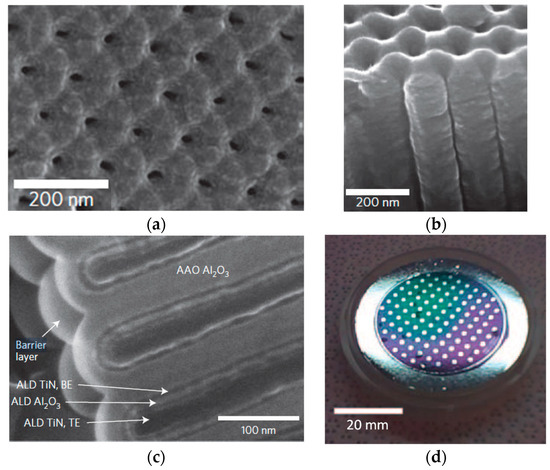MIM nanocapacitor. (a,b) SEM plan-view and cross-section of an AAO MIM structure. (c) The bottom of the tube, showing the AAO barrier layer and three layers corresponding to the TiN bottom electrode (BE), Al2O3 and the TiN top electrode (TE). (d) Two-inch wafer with nanocapacitors. Reproduced with permission from [67]. Copyright (2009), Springer Nature.