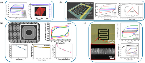 In the meantime, increasing surface capacitance results in a higher time constant, according to this formula, , leading to lower power performance, necessitating a trade-off between capacitance and power capabilities [6]. A pertinent strategy consists of lowering the resistance of the electrode materials [53]. In addition, the energy and power densities can also be enhanced through the topology or configuration of the device (the arrangement or geometry of the positive and negative electrodes) [6,132]. The overview of the schematic topologies used in MSCs, including parallel plate, interdigitated, and three dimensional (3D) interdigitated configurations, is shown in Figure 6a. The interdigitated topology is the most suitable configuration for on-chip MSC applications, having both electrodes in the same plane. However, the amount of active material per electrode is reduced by half due to the inactive gap between the two interdigitated electrode fingers. As a result, the surface capacitance decreases drastically to less than one-fourth of the areal capacitance of a single electrode. In order to enhance the energy density of MSCs, 3D interdigitated configurations have been explored. Lethien et al. [6] provide comprehensive details on the different MSC topologies and configurations. Again, the energy storage capacity can be improved through a 3D electrode design that unblocks the “dead surface” of MSC electrodes while maintaining high mass loading within the device’s footprint area [6,132,133].