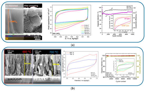 - Ouendi, S.; Robert, K.; Stievenard, D.; Brousse, T.; Roussel, P.; Lethien, C. Sputtered Tungsten Nitride Films as Pseudocapacitive Electrode for on Chip Micro-Supercapacitors. Energy Storage Mater. 2019, 20, 243–252. [Google Scholar] [CrossRef]