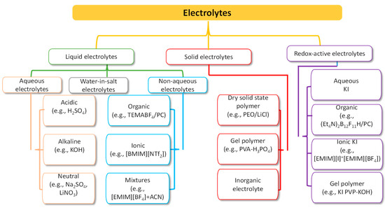- Pal, B.; Yang, S.; Ramesh, S.; Thangadurai, V.; Jose, R. Electrolyte Selection for Supercapacitive Devices: A Critical Review. Nanoscale Adv. 2019, 1, 3807–3835. [Google Scholar] [CrossRef]