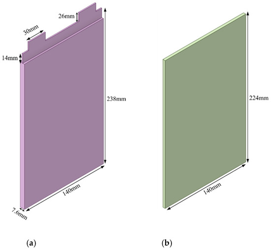 The schematic diagram of the battery with the ERB incorporated is depicted in Figure 1. The figure depicts a prismatic battery with a lithium iron phosphate (LiFeO4) cathode and a graphite anode. The nominal capacity of the battery is 25 Ah, and its dimensions are 140 mm × 7.6 mm × 264 mm (length × width × height). ERB measures 140 mm × 3.9 mm × 224 mm (length × width × height).