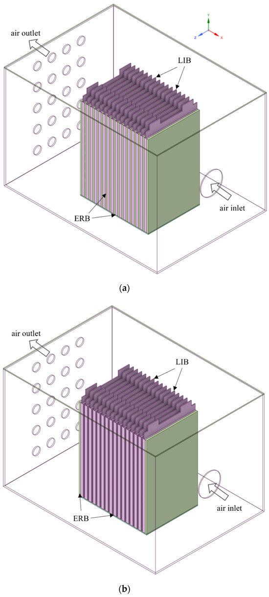 The common methods currently used to enhance lithium-ion battery air-cooling systems, as reported in the literature, may increase the system’s cost, weight, or volume, making it unsuitable for certain applications. However, incorporating an ERB layer between the batteries yields significant advantages, as this design not only enhances the module’s mechanical and electrical safety, but the ERB material itself can also act as a heat storage and transfer medium during battery operation. Additionally, the integration of ERB has minimal impact on the overall cost, weight, and volume of the air-cooling system. This study proposes an air-cooled battery module integrated with ERB layers, and to investigate and compare the thermal performance of the module, which consists of sixteen prismatic batteries, three-dimensional coupled CFD models are developed based on three thermal management schemes. The heat dissipation processes of the battery module under various discharge rates (1C, 2C, and 5C) were simulated to evaluate and compare the performance of the different cooling structures. Additionally, the impact of battery arrangement on air-cooling system performance was also discussed.