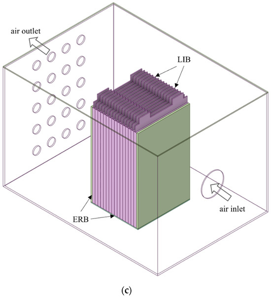Diagram of the air-cooling battery module. (a) air/ERB module (Case 1), (b) air module with spacing between batteries (Case 2), (c) air module without spacing between batteries (Case 3).