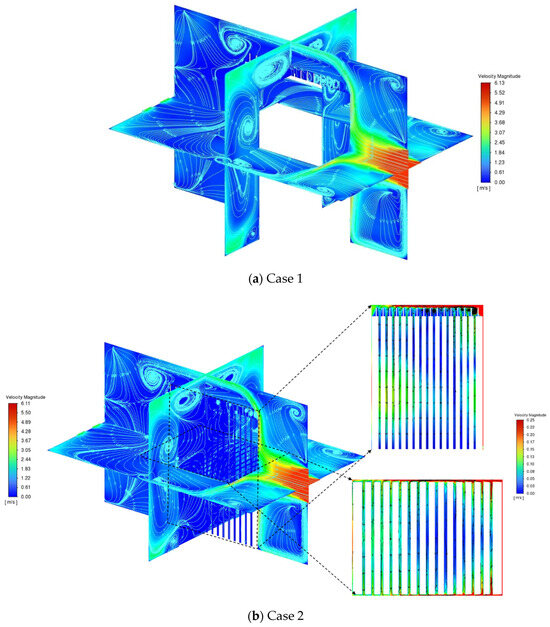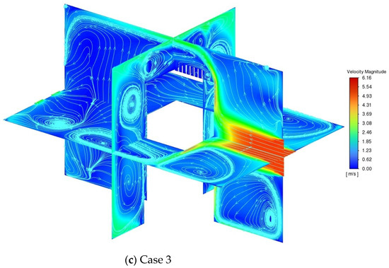Figure 3 depicts the flow field distributions for three cases. The streamlines and velocity contours reveal a high-velocity zone at the air inlet, with a maximum velocity of approximately 6.1 m/s. Upon entering the battery module area, a front-mounted ERB diverts the flow path. This deflection results in a recirculation zone at the bottom of the inlet and airflow directed towards the airbox walls in the remaining directions. Consequently, the air velocity on the battery surface is quite low, as it can be noted in Figure 3b that the air velocity between the batteries is also relatively low for Case 2, with a maximum velocity of approximately 0.25 m/s. The upper part of the air channels between batteries #1, #2, #3, and #4 is the region with the highest air velocity, while the middle region of the air channels has the lowest velocity. The streamlines reveal multiple vortex regions in the airflow, especially near the battery module. These vortex regions could lead to localized uneven cooling, potentially affecting the overall thermal management performance.