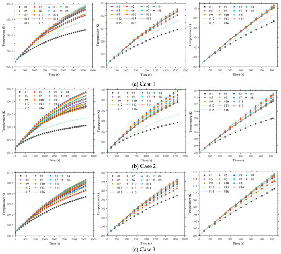 Average surface temperature evolution of 16 individual batteries for the three cases studied: (a) Case 1, (b) Case 2, and (c) Case 3.