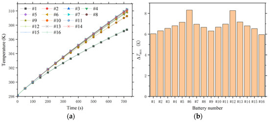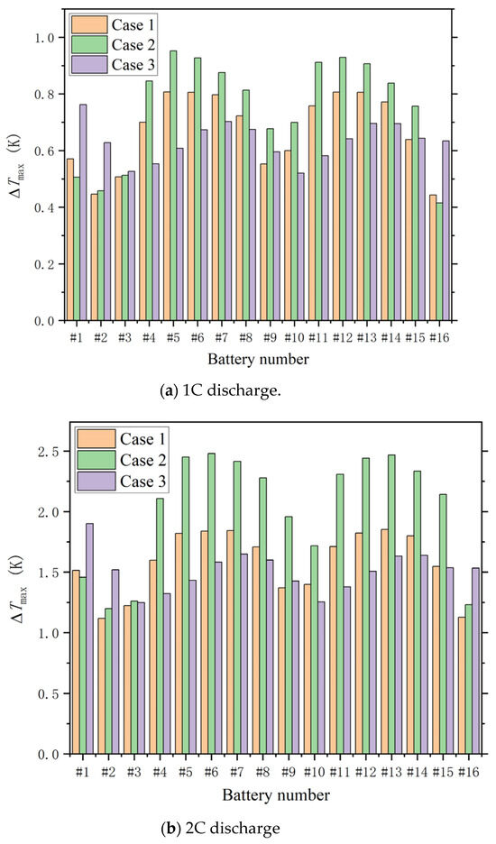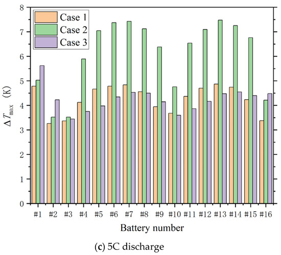 Comparison of the surface maximum temperature difference of 16 single batteries for the three cases studied: (a) Case 1, (b) Case 2, and (c) Case 3.