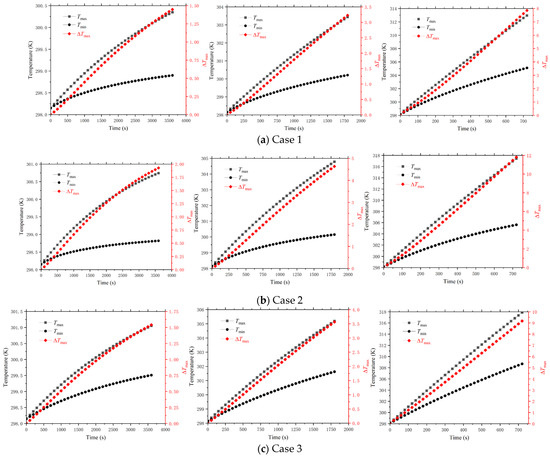 The temperature difference between batteries within a module can impact battery lifespan, and Figure 7 illustrates the highest temperature, lowest temperature, and maximum temperature difference on the battery surfaces within the battery module during the discharge process. For all the cases, Figure 7 indicates that Case 1 has the lowest maximum and minimum battery temperatures. Case 2 has a maximum temperature that is close to Case 3, and its minimum temperature is higher than Case 3 during both 2C and 5C discharge processes. Additionally, the maximum temperature difference between batteries is less than 5 °C for all three cases under 1C and 2C discharge conditions. The temperature difference is smallest for Case 1 and largest for Case 2. At a discharge rate of 5C, the maximum temperature difference for all three cases exceeds 5 °C. In particular, the maximum temperature difference reaches 12 °C for Case 2. Figure 7 also shows that for Case 1, the addition of an ERB between the batteries not only lowers the minimum temperature of the batteries but also has an equalizing effect. In contrast, for Case 2, although there is an air channel between the batteries, the air channel is very narrow. Due to the low thermal conductivity of air, the temperature difference between the batteries is large; therefore, under high-rate discharge conditions, the thermal management methods adopted for the three cases cannot effectively lower the temperature of the batteries. Consequently, it is necessary to consider coupling with other thermal management methods or optimizing the thermal management structure.